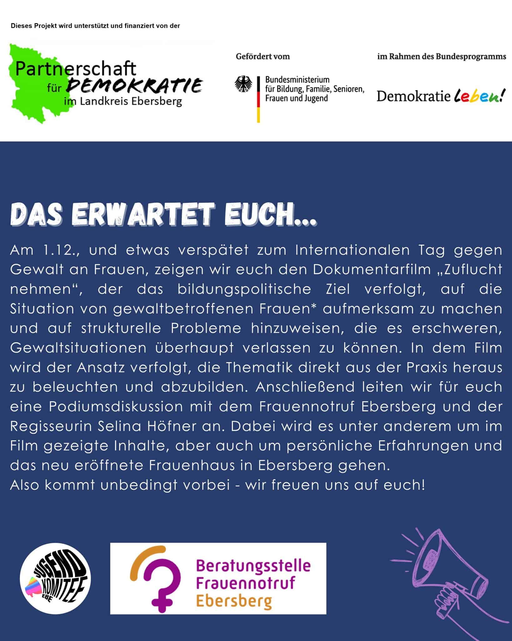 Veranstalter: Jugendkomitee Ebersberg, Frauen helfen Frauen im Landkreis Ebersberg e.V / Partnerschaft für Demokratie, Julia Bissinger, julia.bissinger@kjr-ebe.de, 0160/1622104